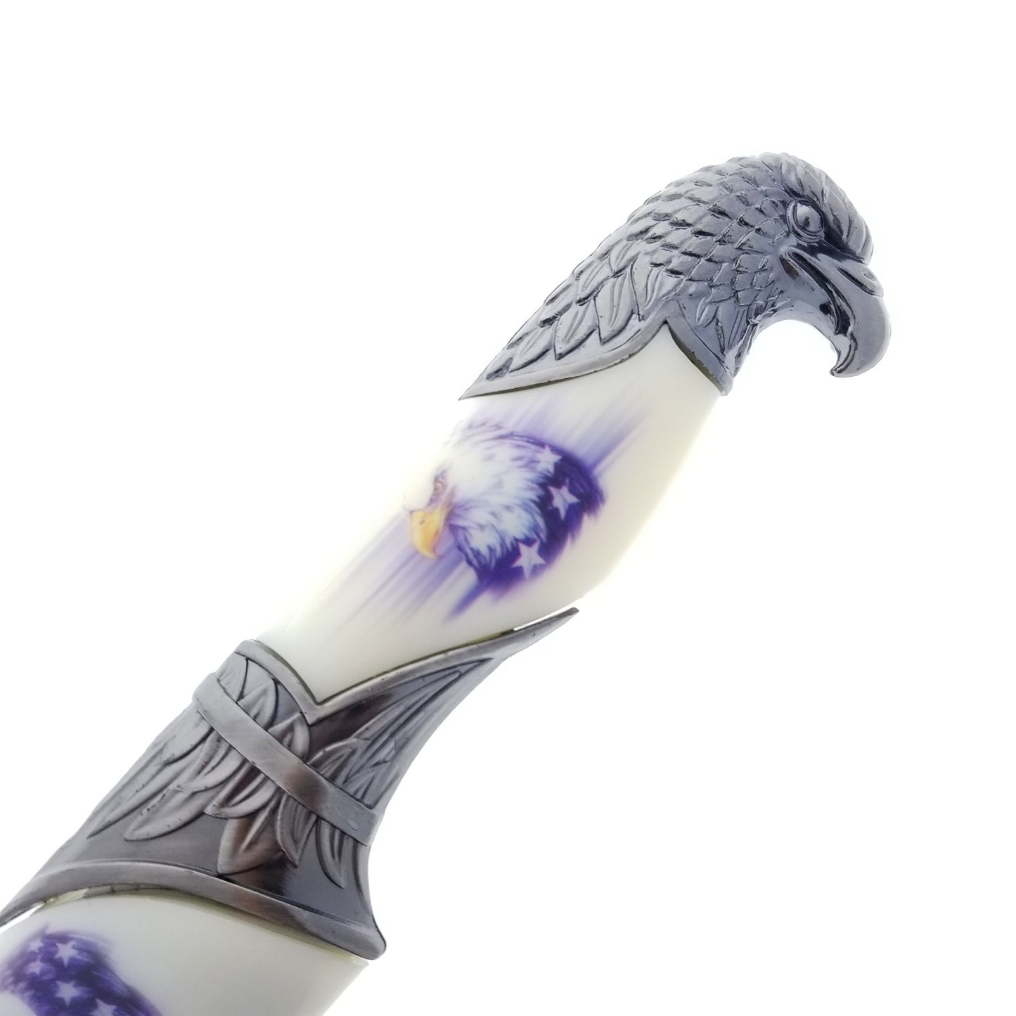 This 13 12" Fantasy dagger is designed with a 440 stainless engraved blade and an overall length of 13 1/2", featuring an American Flag Eagle design. Its durable white scabbard is perfect for safe transport and storage. With its sharp, stainless steel blade and detailed design, you can trust that you have a quality and reliable weapon.