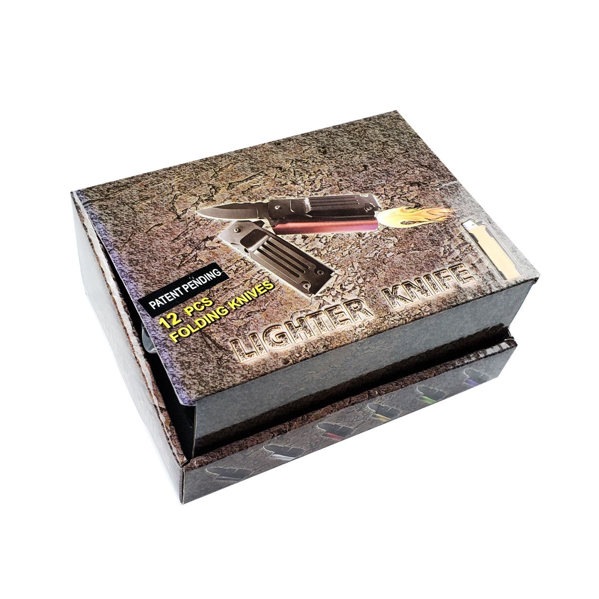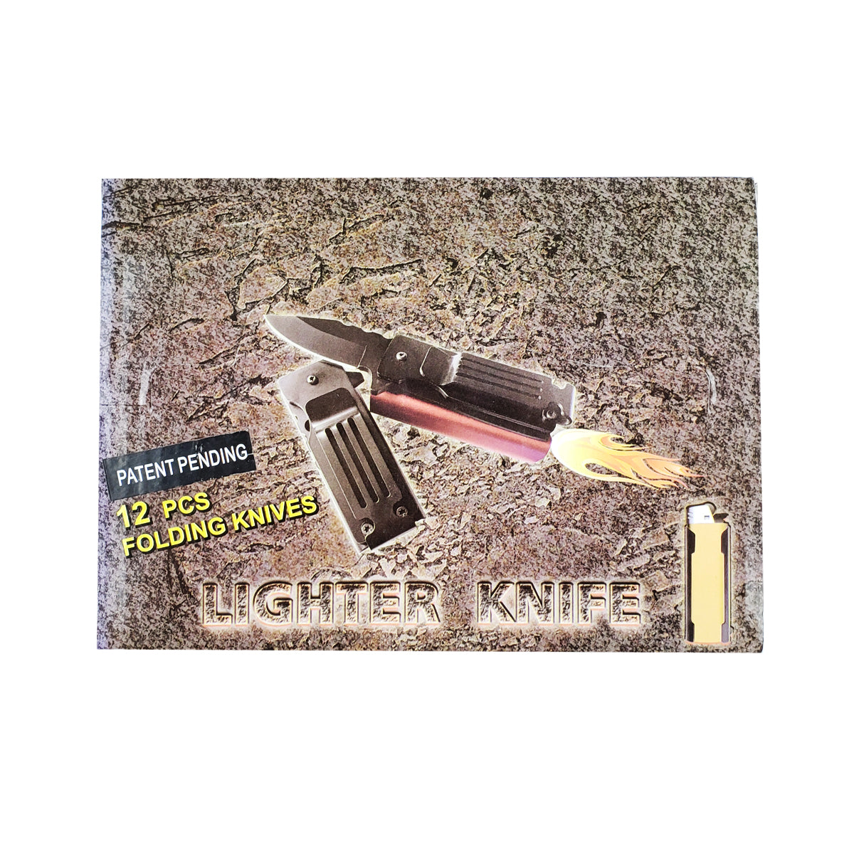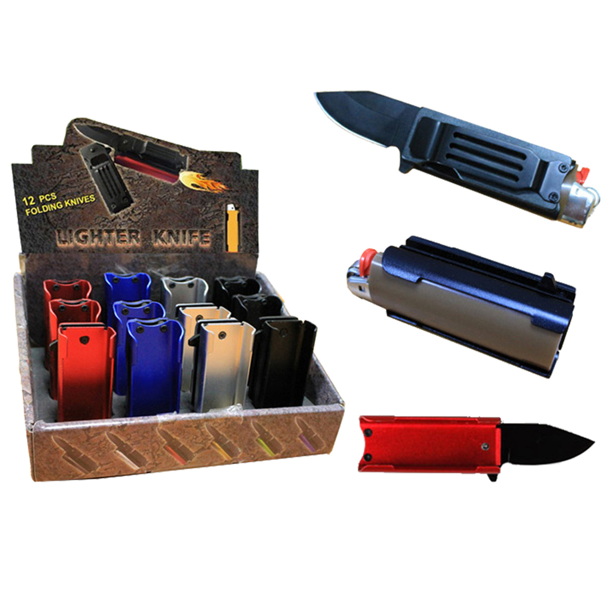 This 12 piece set features 4 1/2" overall length and 2 1/2" blade more designed with spring assisted lighter knife in 4 different colors, fitting a regular lighter, crafted from 440 stainless steel quality material. Perfect for your daily activities, this knife is perfect for outdoor, camping, and tactical activities.