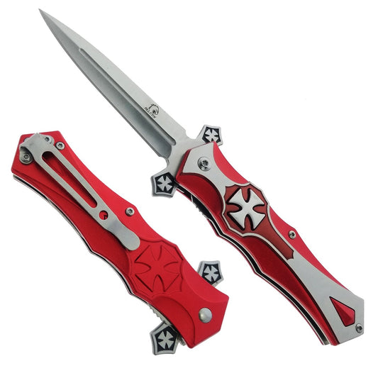 Falcon 8.25" Spring Assisted Knife Red Handle w/ Fire Starter & Flashlight