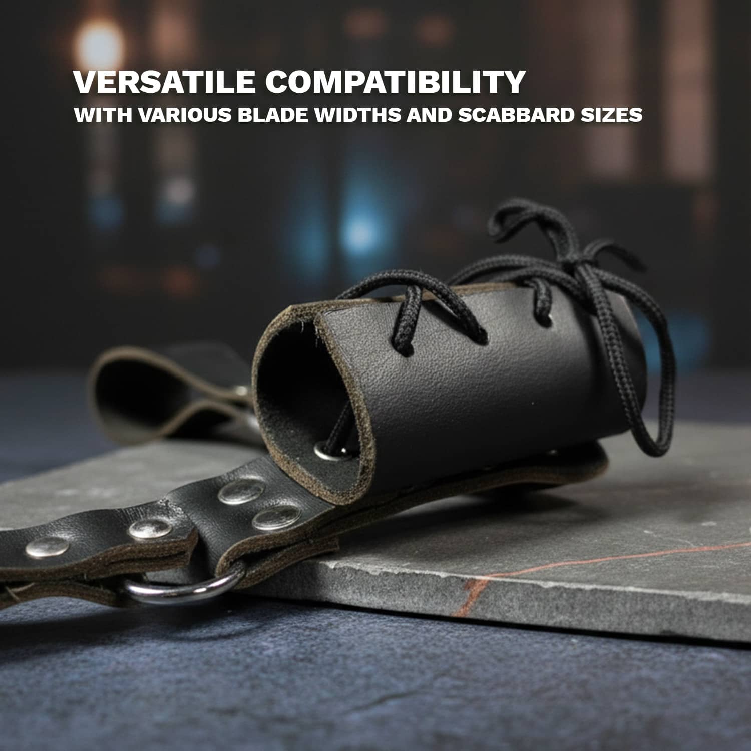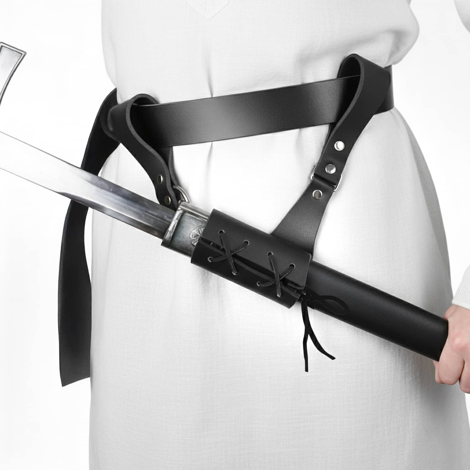 Secure your medieval rapier with authentic style using this 8" x 8" faux leather sword frog. Crafted to replicate traditional leather construction, this practical accessory keeps your blade safely positioned at your side during reenactments, displays, or collections. The durable faux leather material resists wear while maintaining a period-accurate appearance. Perfect for historical enthusiasts, performers, and collectors seeking reliable sword retention without premium pricing. Ideal for wholesale distribution to costume shops, historical venues, and martial arts retailers.
