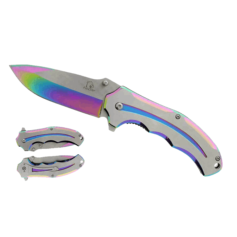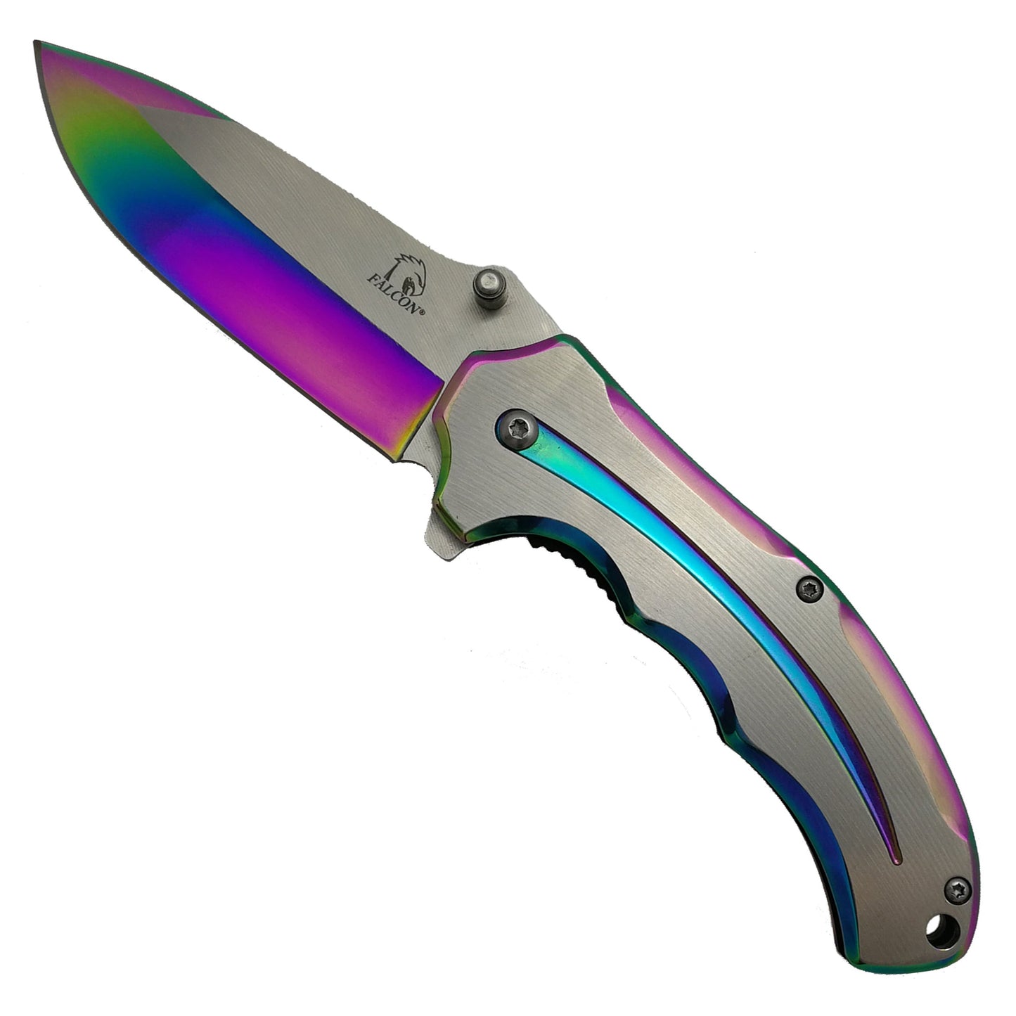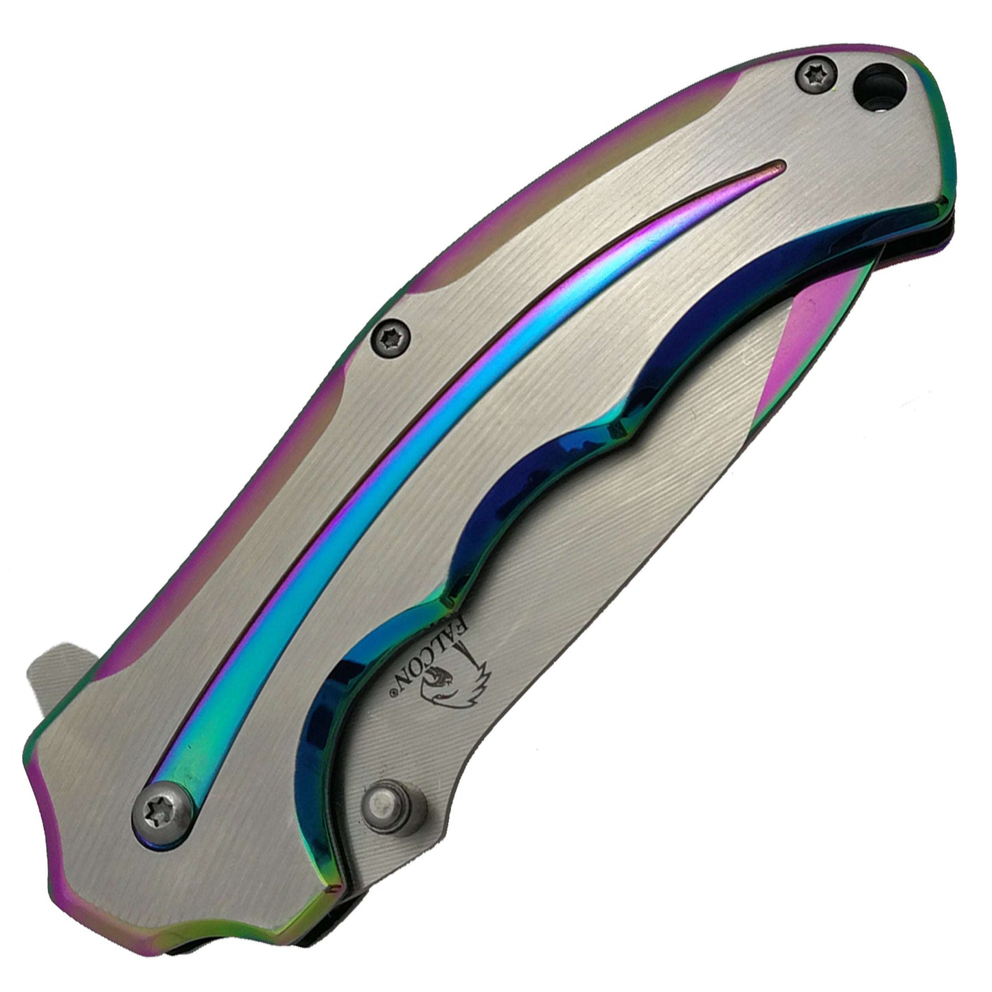 The Falcon 7 3/4 Two Tones Silver & Rainbow Metal Handle is an efficient, spring assisted knife with an overall length of 7 3/4". The 3 1/4" plain blade features a striking two tones silver & rainbow metal handle for added grip and maneuverability. A reliable companion for outdoor and tactical activities.