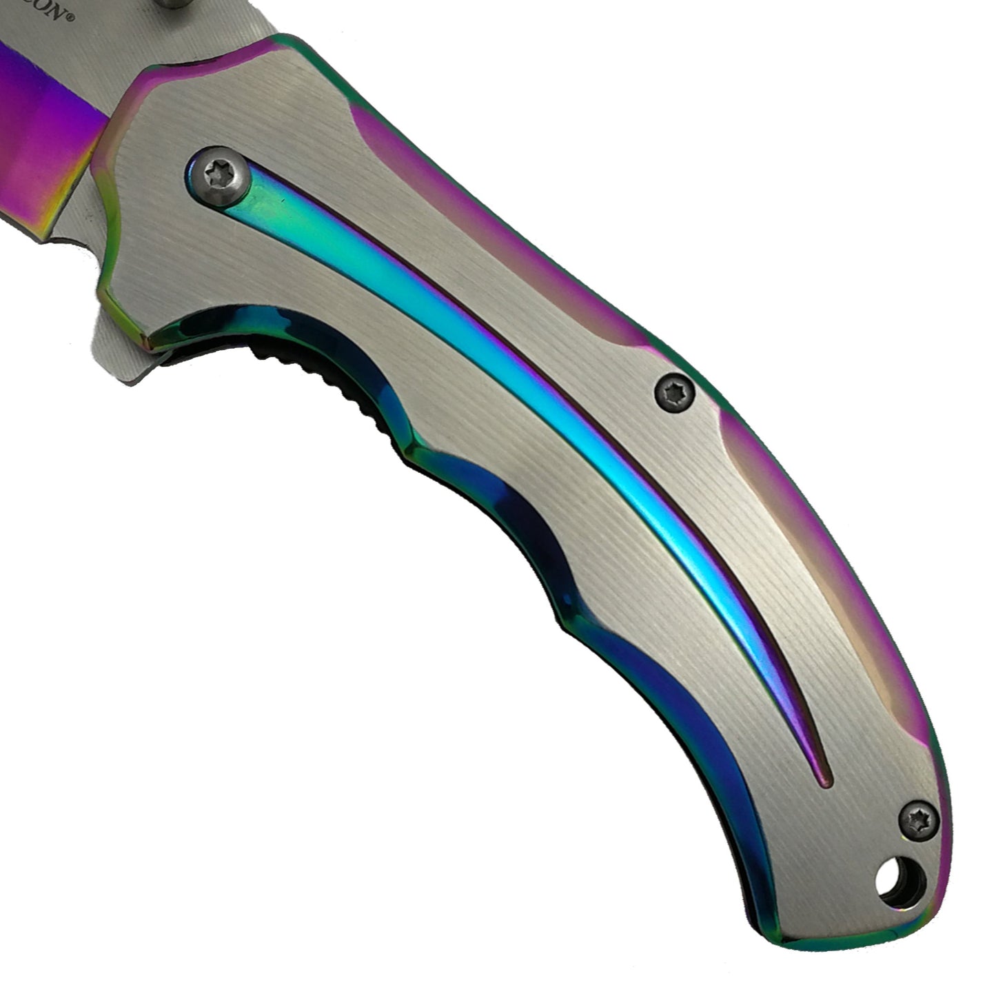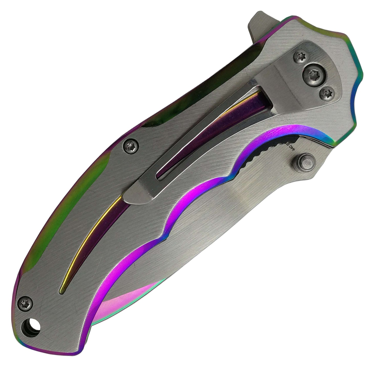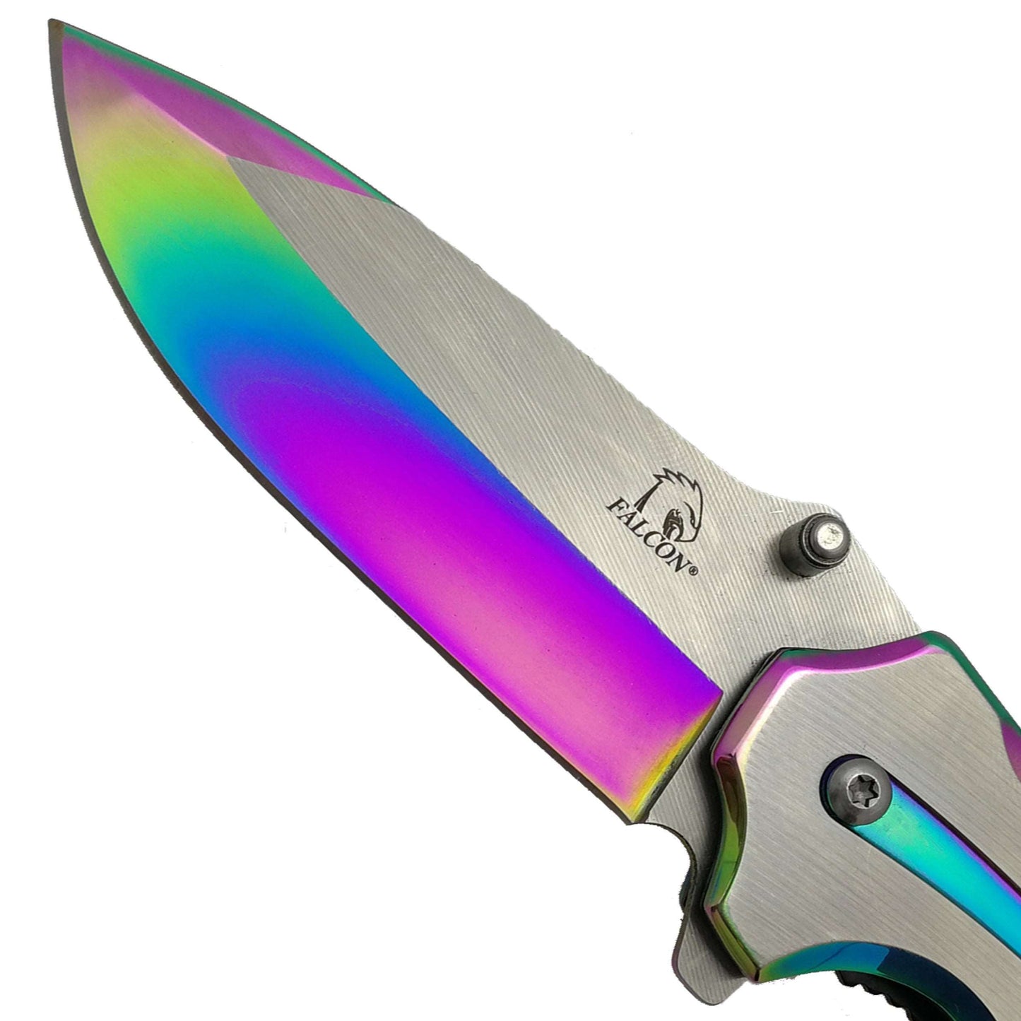 The Falcon 7 3/4 Two Tones Silver & Rainbow Metal Handle is an efficient, spring assisted knife with an overall length of 7 3/4". The 3 1/4" plain blade features a striking two tones silver & rainbow metal handle for added grip and maneuverability. A reliable companion for outdoor and tactical activities.