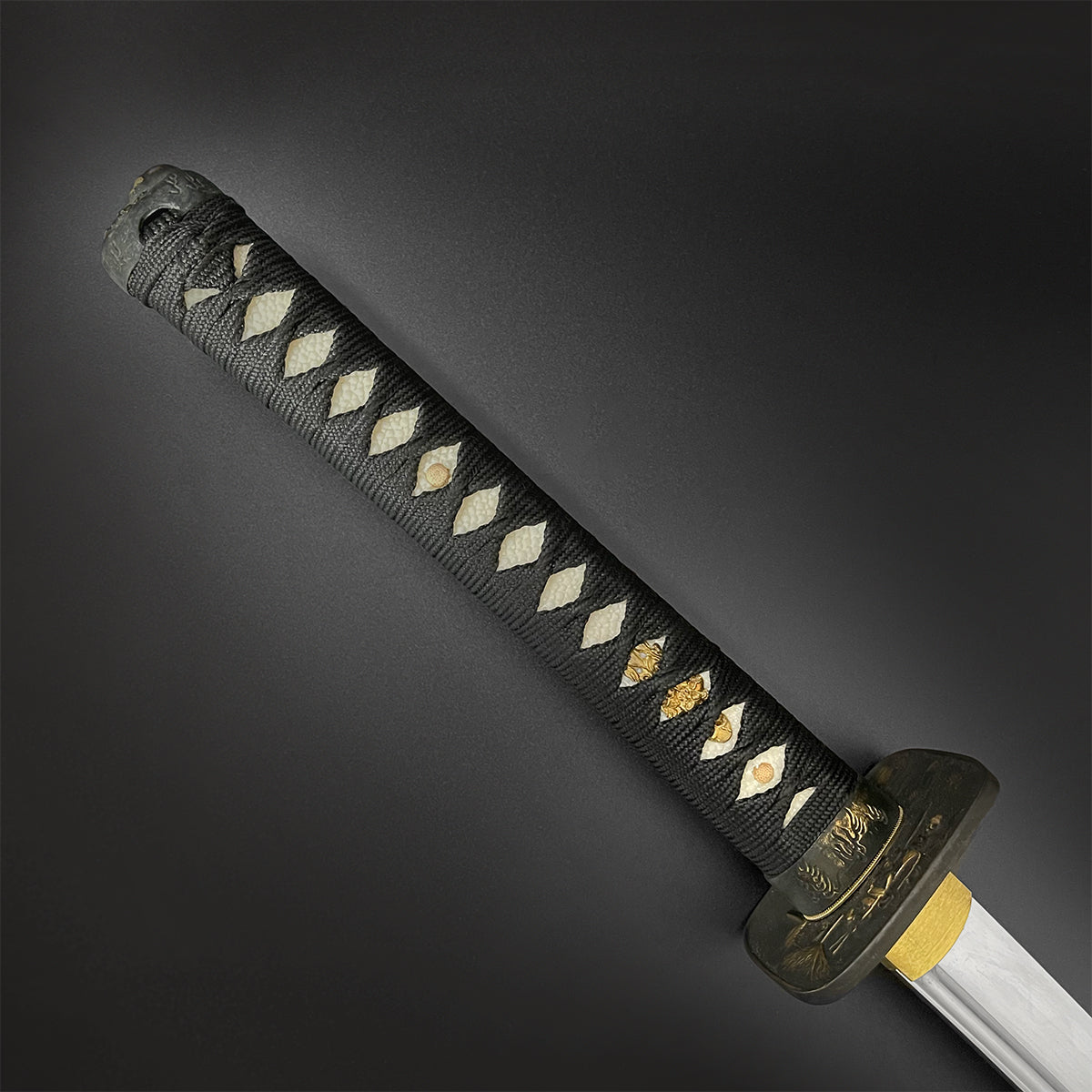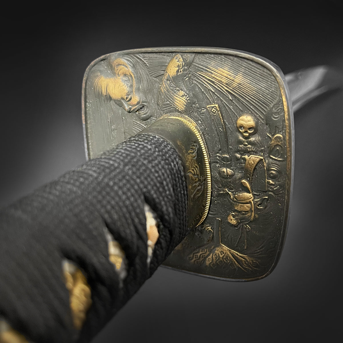 The detailed Kaku Gata style copper tsuba depicts an Oni Demon lord commanding his marching yokai army. In Japanese folklore the Oni is a type of demon known for it’s fierce and evil nature. They possess intriguingly complex aspects that cannot be brushed away simply as evil. They are feared throughout Japan. The copper kashira and fuchi also follows the demonic theme. The wood handle is real ray skin wrapped in traditional black cotton cord alongside the two tone tsuba, this Oni katana is a great piece to your traditional katana collection.