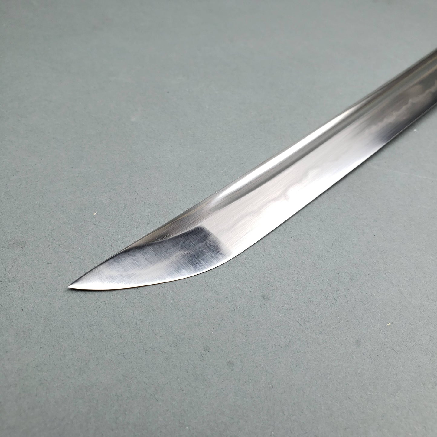 From the ever-popular Shirakawa series from the Musashi Silver Collection comes the Musashi Ryu Katana. This beautifully hand crafted katana is forged using the traditional Japanese technique known as Muku-kitae. The blade is clay tempered using 1060 carbon steel. The hamon and hardness (55 HRC) were created during the tempering process. It features a real ray skin handle wrapped in black cotton cord. The Fuchi and Kashira are made of brass and the Tsuba features a hand etched design. The saya is glossy burgundy