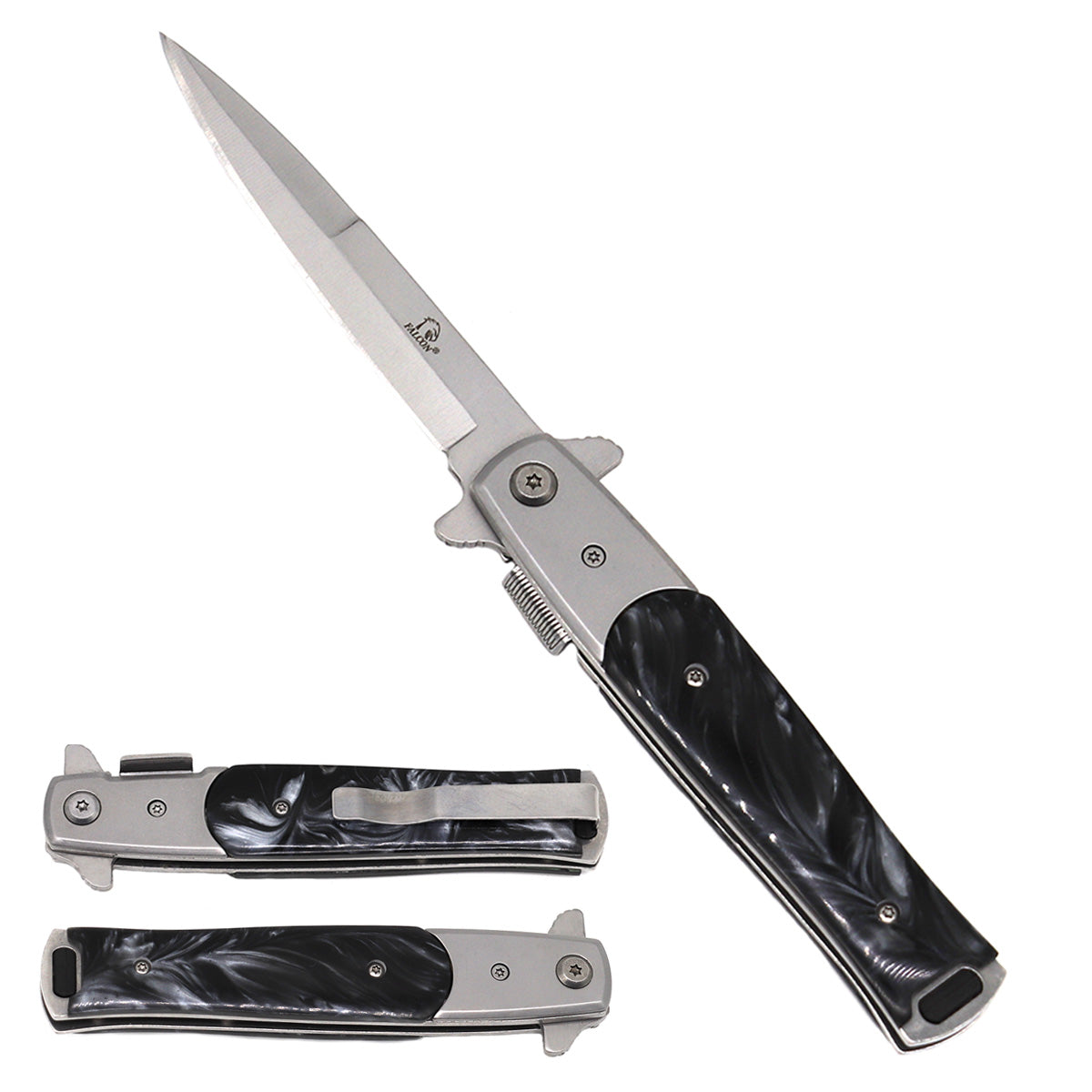 The Falcon 8 3/4" Blue Pocket Knife is built with a 4 3/4" Faux White Marble Handle and 4" Black Blade Spring Assisted Knife. The 440 Stainless Steel Blade is strong and reliable, providing optimal sharpness and durability compared to similar products. Keep your gear safe and secure with this sleek gold pocket knife.