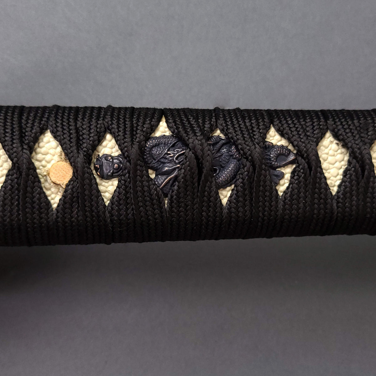 The tsuba depicts Shinryu the dragon of the skies. The dragon is known to control the wind, clouds, and the rain to keep balance for all life. It is praised for bringing balanced weather throughout Japan, but when angered it summoned thunderstorms.